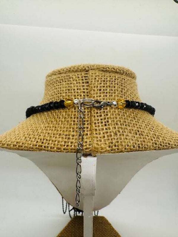 SteamPunk Bee Pendant Necklace strung with crystal cut black glass beads and silver & yellow topaz-colored accents. 19" long with a 2 1/2" extension chain.
