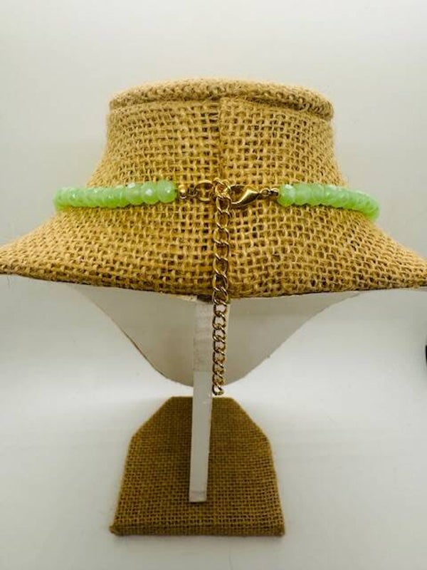 Multi-colored (yellow, orange and green) spiked choker/necklace with light green crystal-cut beads and cracked glass bead accents. 17” length and 3 ½” extension chain.