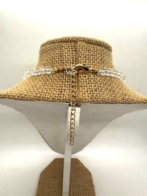 Large Quartz stones strung with clear crackle glass beads and gold blingy accent beads.